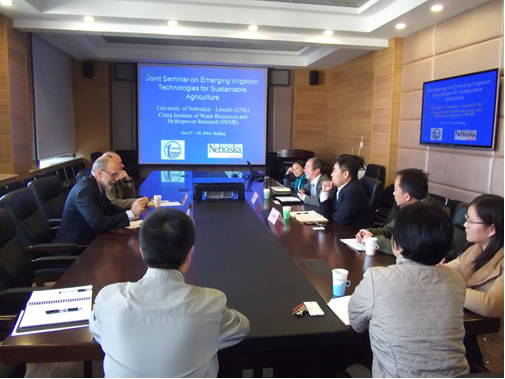 2014年10月27-29日,美国内布拉斯加大学校长助理罗纳德·约德(Ronald Yoder)教授、粮食和水学院主任克里斯托弗·尼尔(Christopher Neale)博士来访我院,在双方已签署的合作备忘录框架下开展交流合作。院总工程师高占义会见了约德教授一行。出席会见的还有水利研究所李益农副所长及相关研究室负责人。