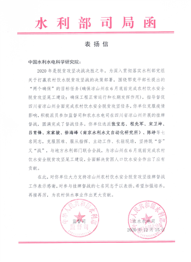 2020年6月底,凉山州7个县完成农村饮水安全脱贫攻坚尾工建设,贫困人口饮水安全问题得到全面解决。中国水科院参与凉山州7个县挂牌现场督战的7名同志受到水利部监督司和农水水电司的表扬。